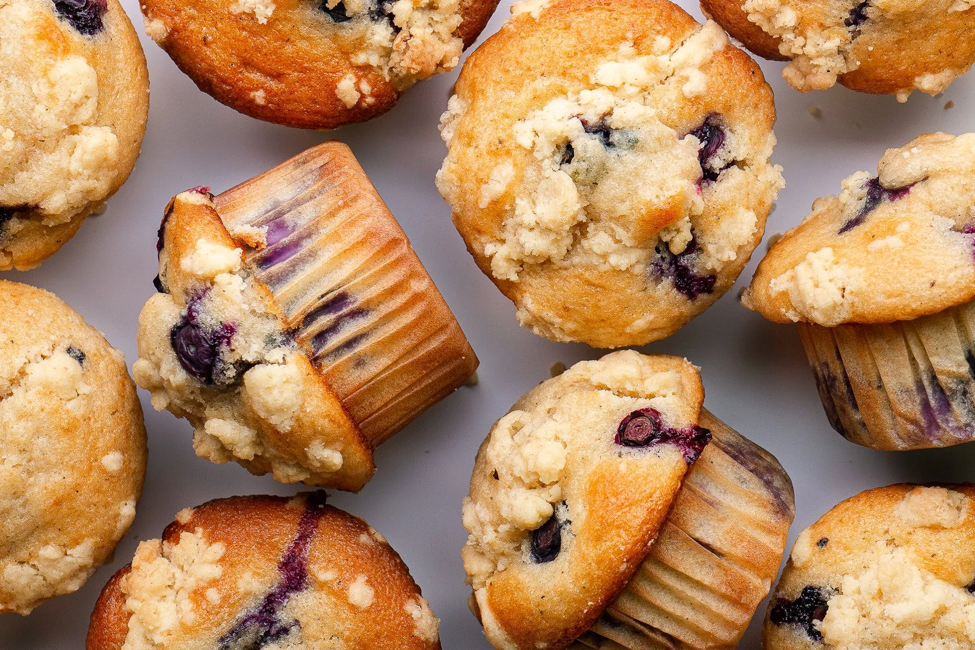 Die Muffin-Masse bis zum oberen Rand der Muffinförmchen einfüllen. Die Muffins mit den Streuseln bestreuen und zwei bis drei Blaubeeren auf jeden Muffin setzen.