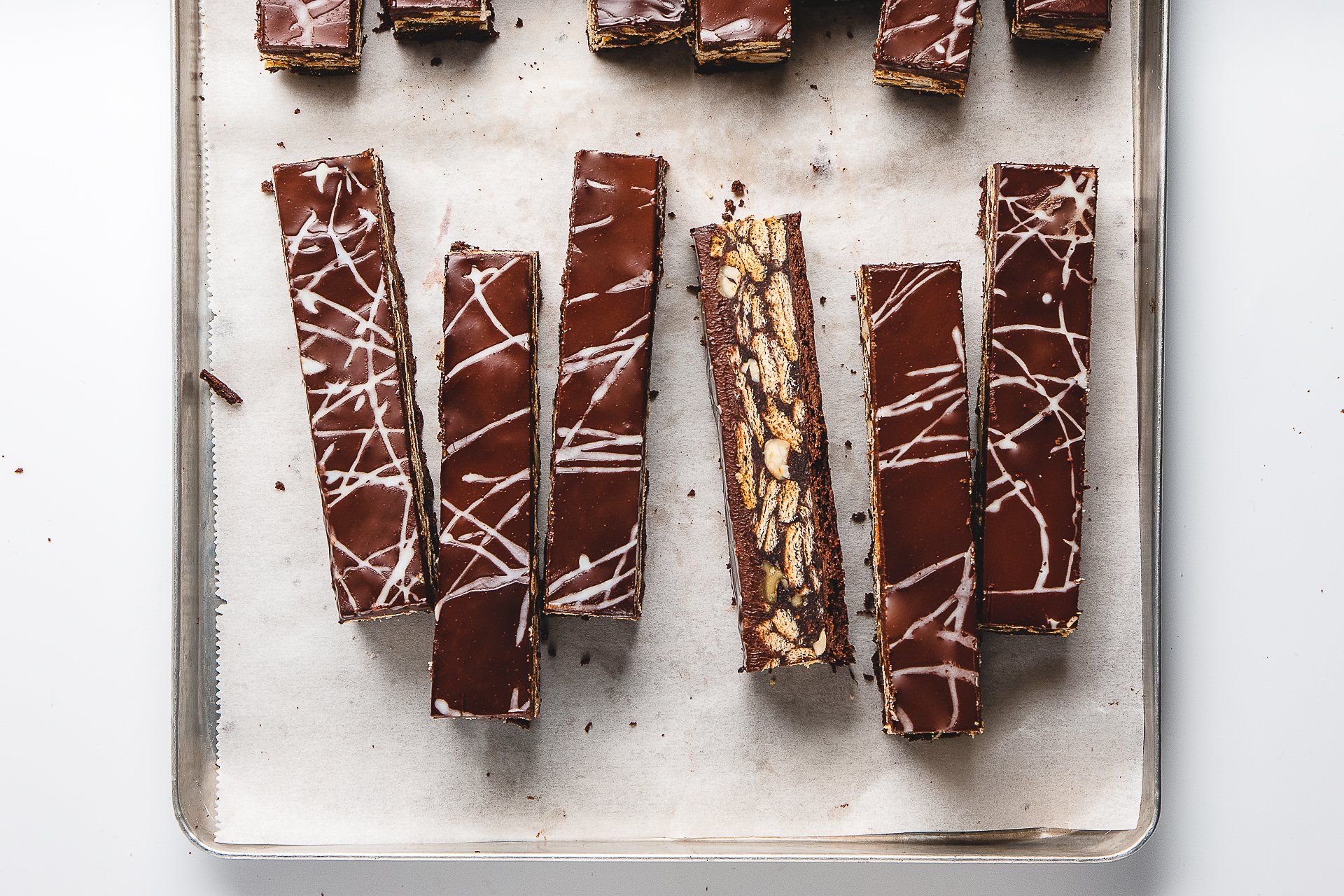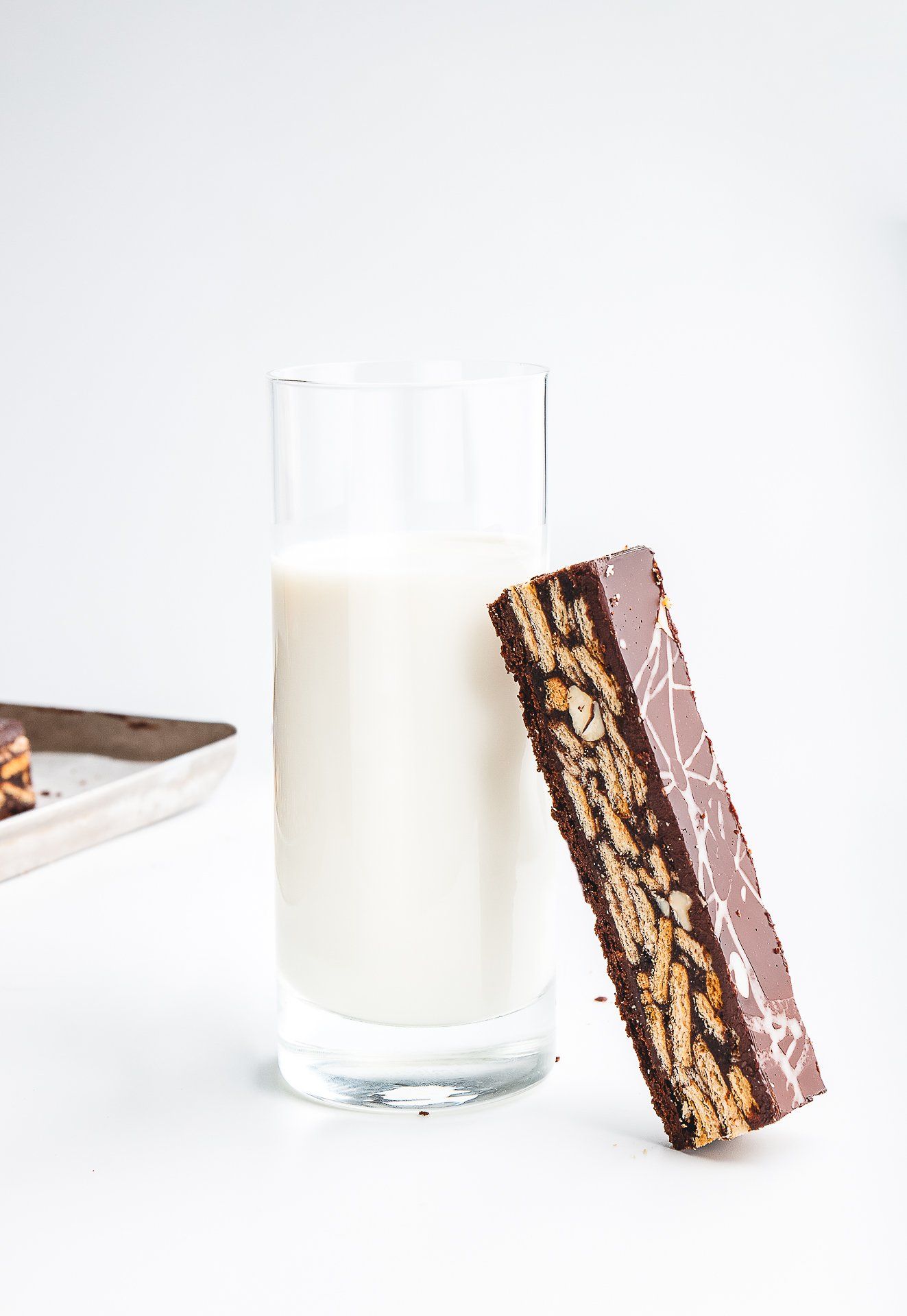 Bei diesen Riegeln habe ich die Masse um einen Mürbteig-Boden und eine dunkle Schokoladen-Ganache ergänzt. So entstehen leckere Keks Riegel, die sich perfekt als Snack zu einem Glas kalte Milch eignen.