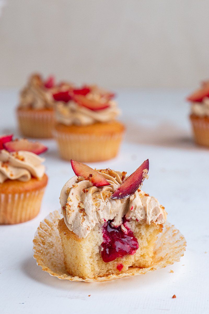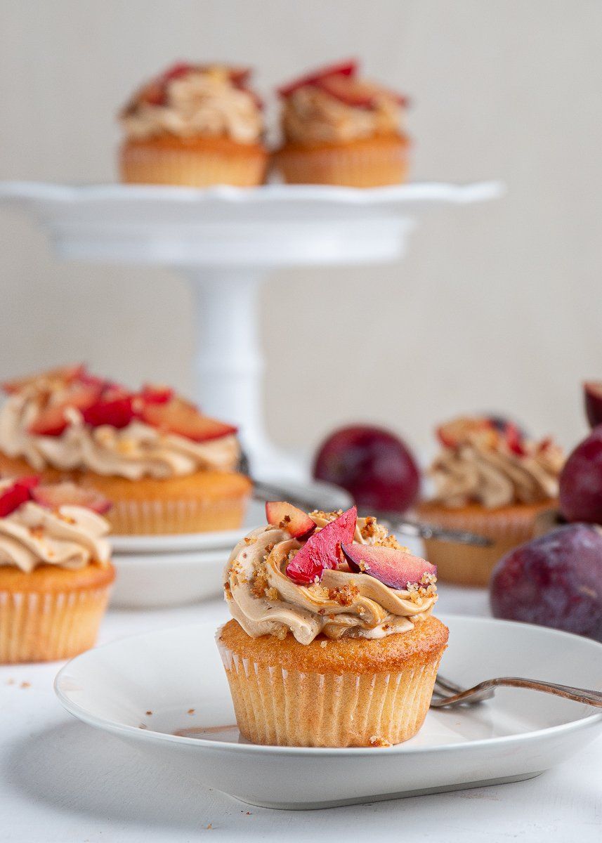Für die Pflaumen-Füllung habe ich die Pflaumen im Ofen mit etwas Zucker gebacken. Ich finde durch das Backen intensiviert sich der Geschmack etwas mehr. Je nach Reifegrad der Früchte könnte mann noch etwas Zucker zusätzlich hinzugeben. Ich finde aber gerade die säuerliche Pflaumen-Füllung zur süßen Karamell-Buttercreme passend. Die gerösteten Cupcake-Brösel sorgen für ein toastiges, buttriges Aroma. Ich wünsche euch viel Freude beim Backen, Julia!