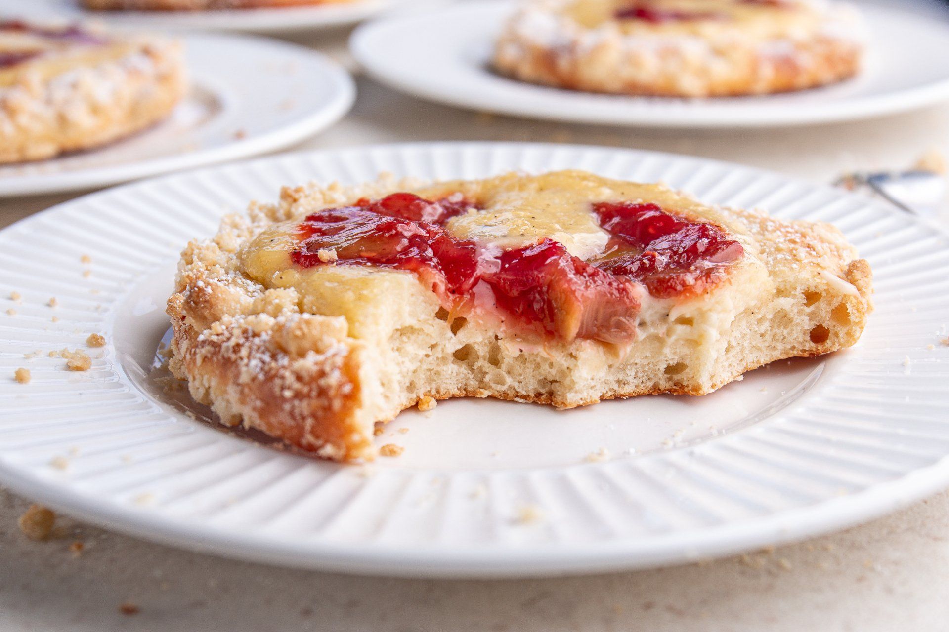 Den Pudding kurz geschmeidig rühren und mit der Rhabarber-Füllung in die Mitte der Hefeteilchen füllen. Die Teilchen bei 230°C Ober- und Unterhitze für 9-10 Minuten backen. Nach dem Abkühlen mit Puderzucker bestäuben.